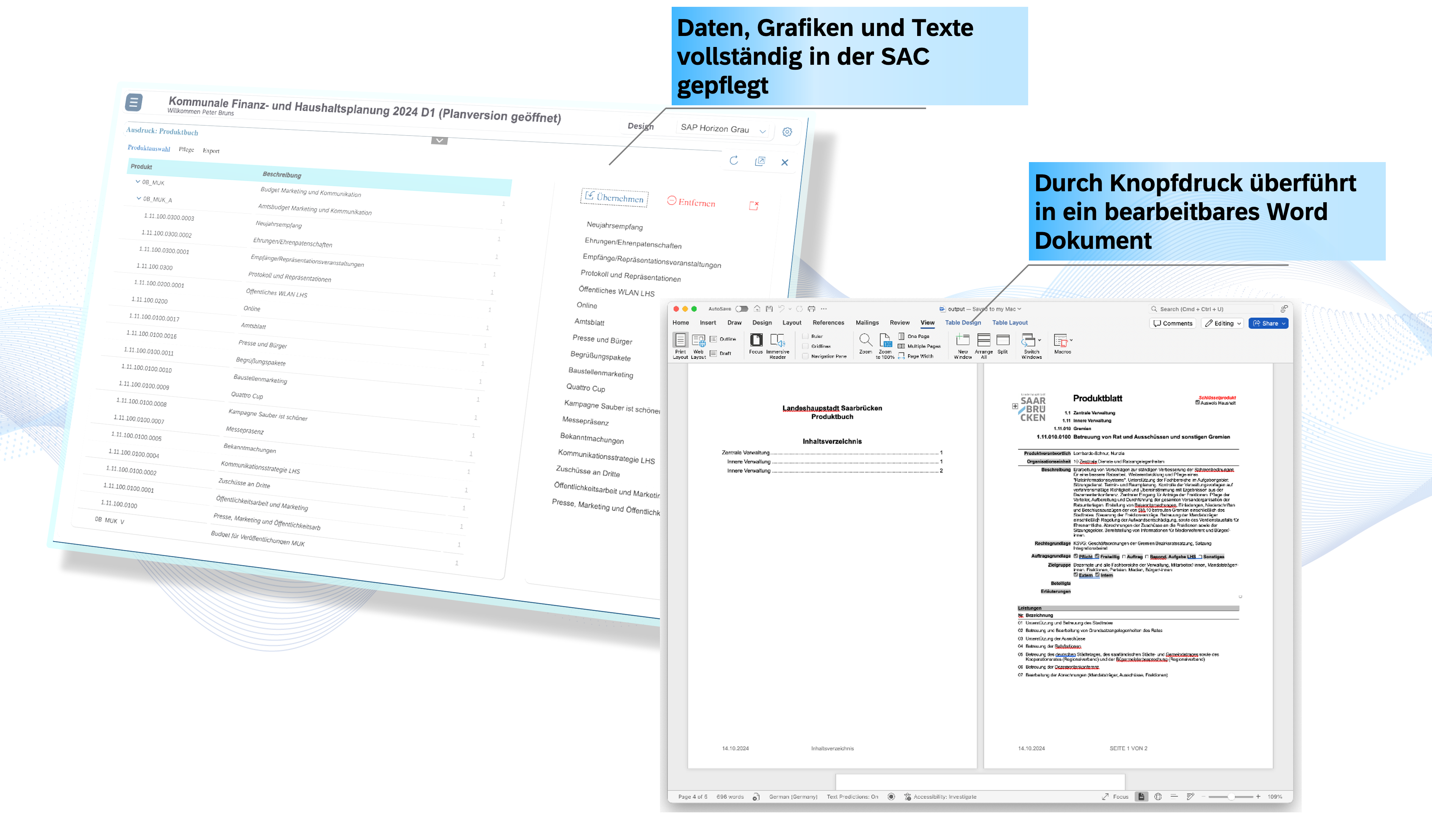 Dies ermöglicht es, SAC-Inhalte wie Tabellen, Grafiken und Texte in ein bearbeitbares Word-Dokument zu überführen, was die Erstellung und Anpassung von Berichten erheblich erleichtert.