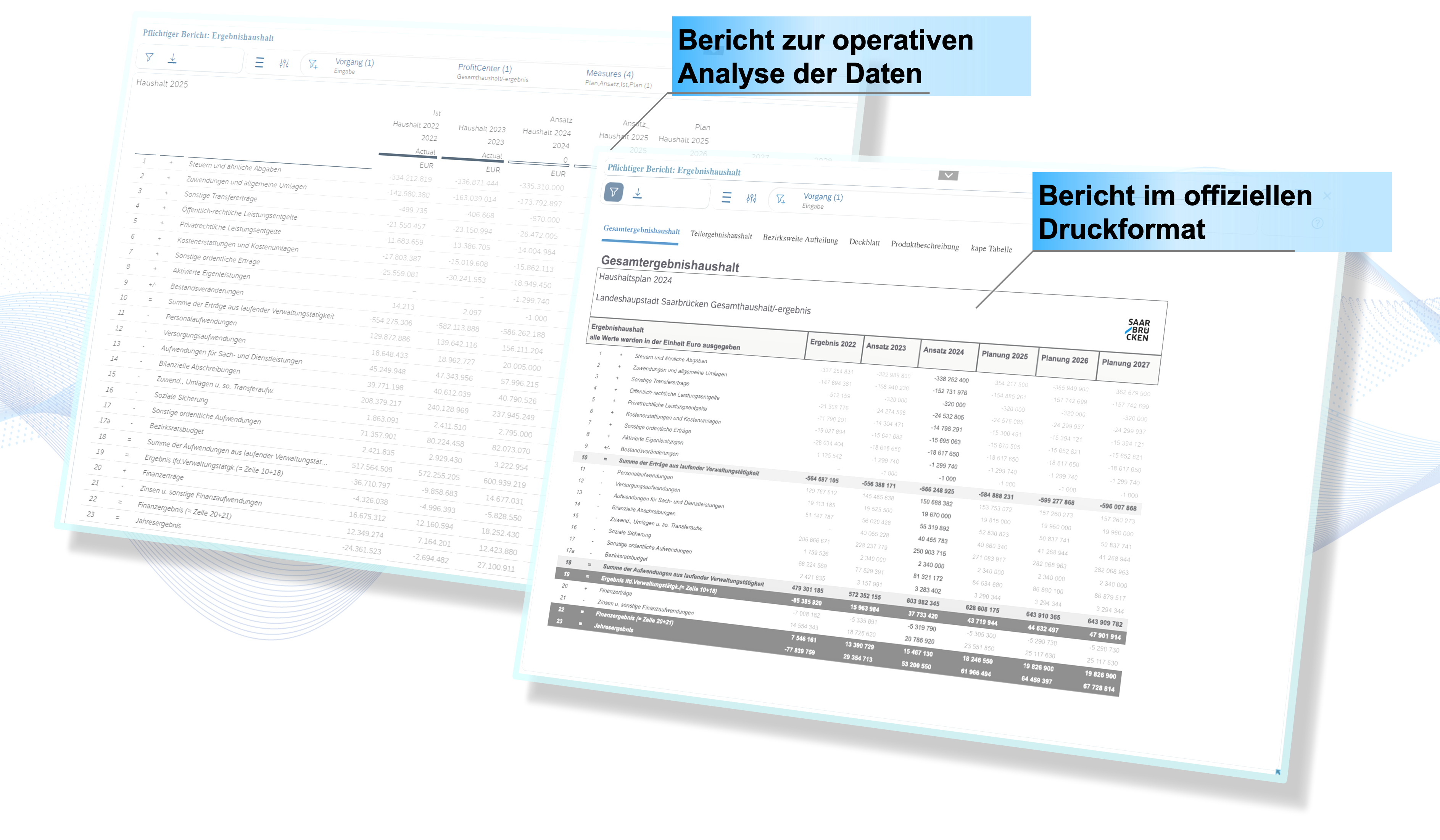 Gemäß den gesetzlichen Vorgaben werden Berichte des Haushaltsplans, wie der Ergebnishaushalt, das Investitionsprogramm und der Finanzhaushalt, direkt aus der SAC als formatierte Berichte erstellt. Diese Berichte sind präzise und übersichtlich gestaltet, um den Anforderungen der gesetzlichen Bestimmungen gerecht zu werden.